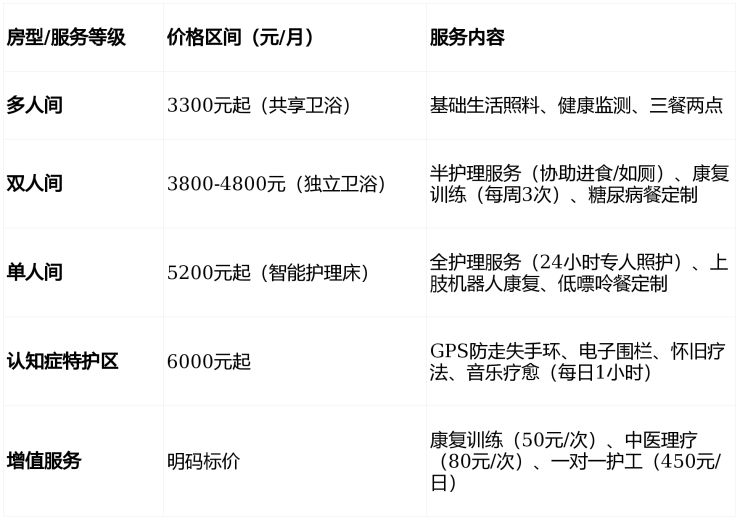 收费价格:3300-5200元/月(含基础照护、餐饮、住宿)