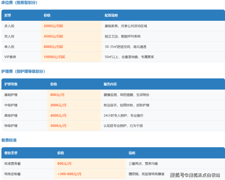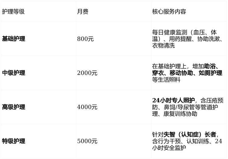 费用总结示例:一位入住双人间、需要中级护理、选用基础餐的长者,月度综合费用约为:4500(床位)+ 2000(护理)+ 800(餐费)=7300元/月。