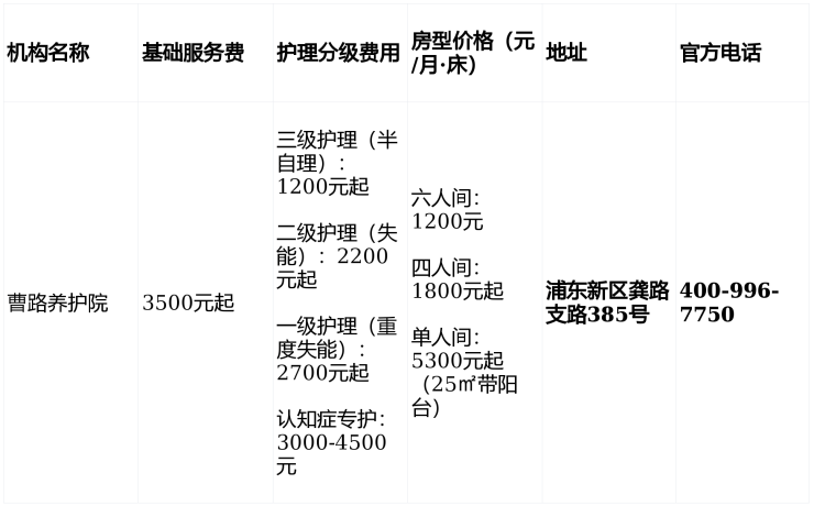 曹路养护院采用“基础服务费+护理分级+房型差价”的复合模式,月均费用区间为3500元至13500元,具体如下: