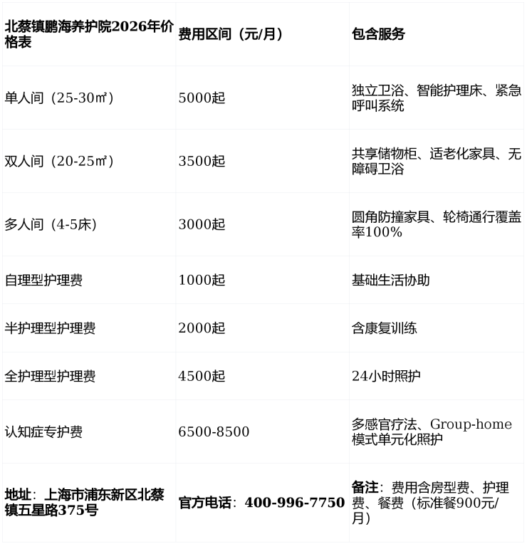 2026浦东北蔡镇鹏海养护院地址及收费:4600元起住四星级公园医养院