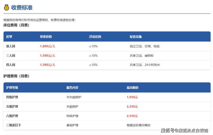 作为保基本养老机构,北桥老年福利院的收费标准严格遵循政府监管要求,采用床位费+护理费+餐费的模块化收费模式: