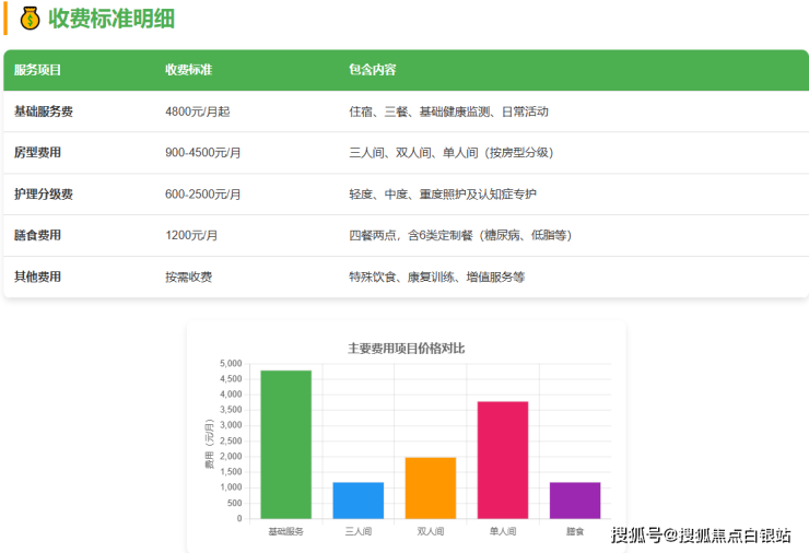 总费用说明:根据长者实际身体状况和选择的房型,月费用在4800-13350元之间浮动,所有费用项目均在入住前明确告知,无任何隐藏收费。