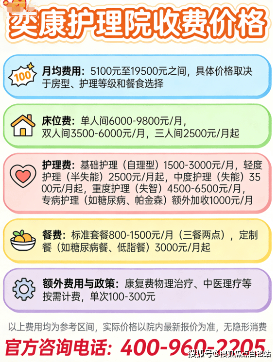 上海奕康护理院采用“床位费+护理费+餐费+增值服务”的分项计价模式,最低5100元/月起,具体构成如下👇: