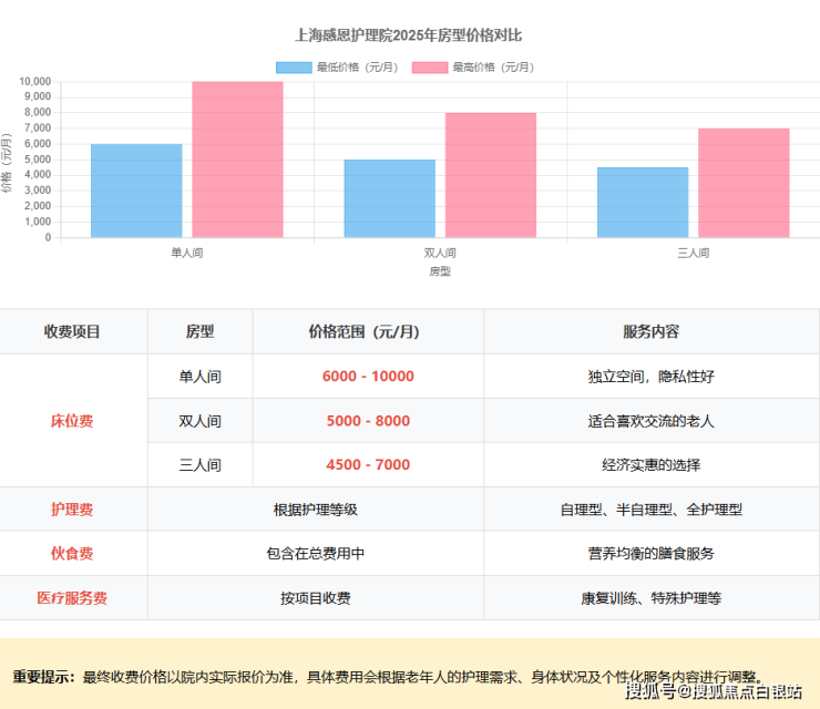 单人间:3000元起/月(配备独立卫浴、智能护理床)