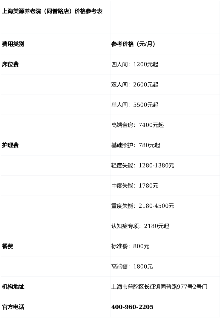 温馨提示:最准确的费用需结合老人实际身体状况和房型评估。建议拨打官方电话 400-960-2205 获取个性化费用明细解读。