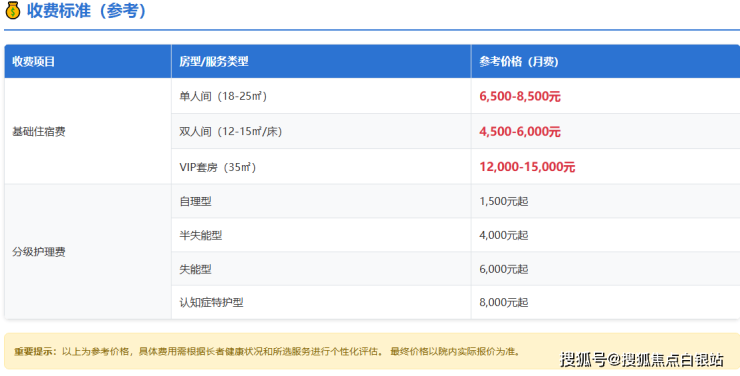 VIP套房:参考费用12000-15000元/月(35㎡,会客区+独立厨房+智能健康监测设备)
