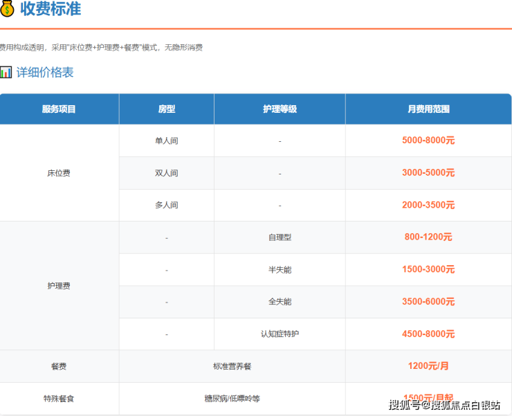 星辰家养老院采用"床位费+护理费+餐费"的模块化收费模式,月均费用区间为4800元至13800元。具体构成如下: