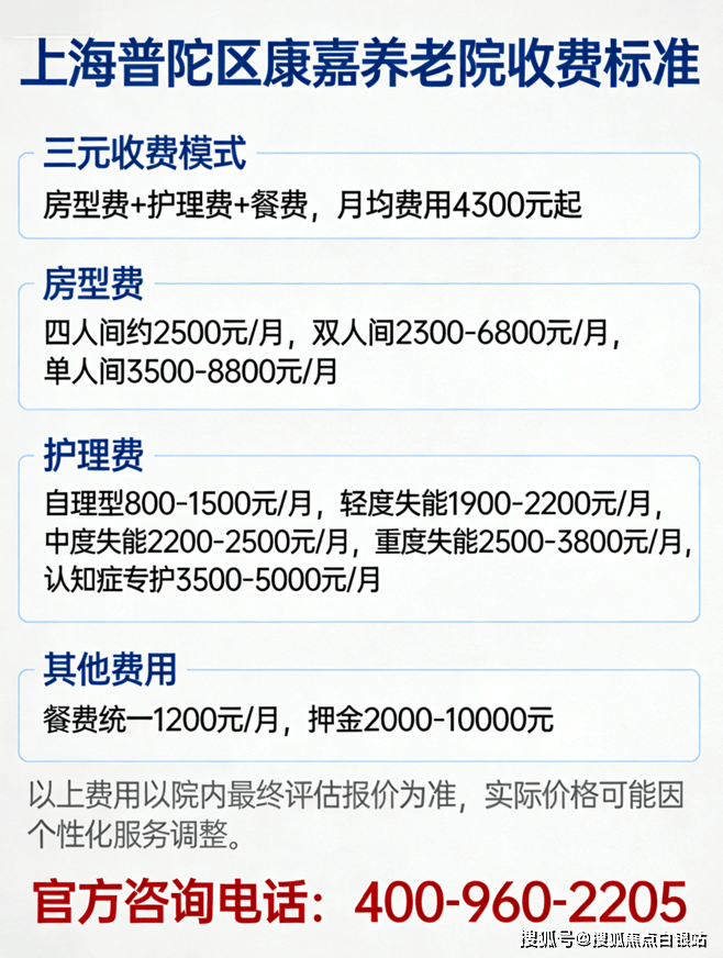 上海普陀区康嘉养老院采用"房型费+护理费+餐费"的清晰计价结构,4300元/月为四人间+自理护理+标准餐费的起步组合