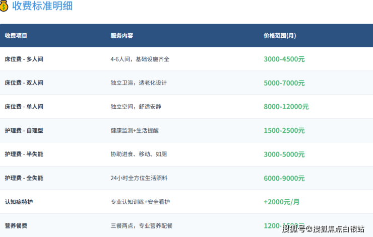 综合示例:一位选择双人间、需要半失能照护的长者,月费用大致为:床位费5000元 + 护理费3000元 + 餐费1200元 =9200元左右。具体需以院方评估为准。