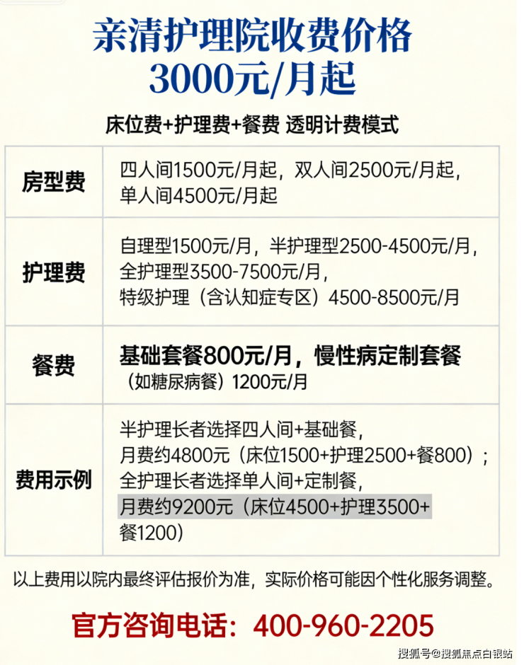 亲清护理院收费价格3000元/月起,采用“床位费+护理费+餐费”的透明计费模式