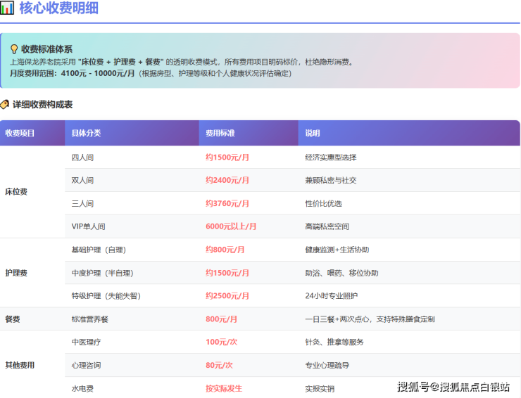 这是所有家庭最为关心的核心问题。上海保龙养老院采用“床位费 + 护理费 + 餐费”的分项收费模式,所有费用明码标价,遵循透明公开原则。