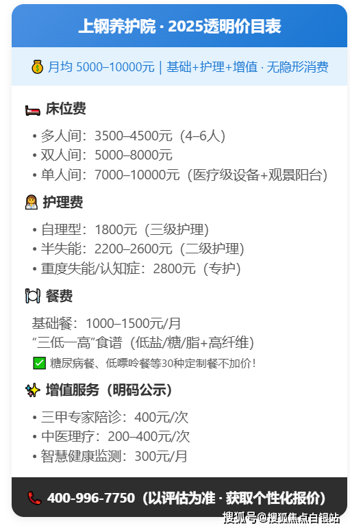 上钢养护院采用“基础费用+分级护理+增值服务”的阶梯收费模式,月均费用区间为5000元至10000元,具体构成如下: