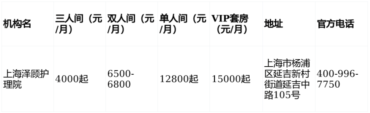 上海泽顾护理院价格:6000元/月起(含床位、护理、餐费)