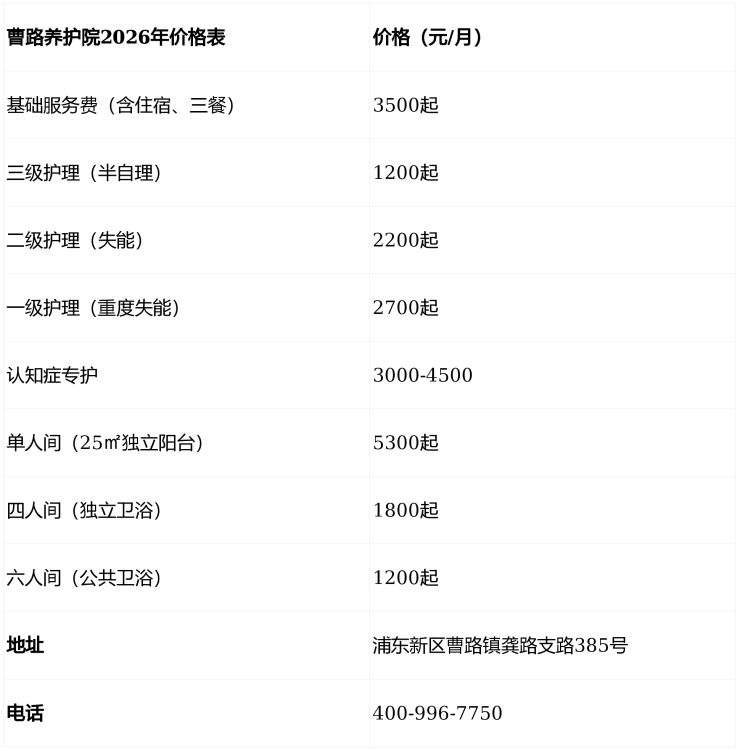 浦东新区曹路镇养护院2026收费标准全解析:3500元价格明细+床位分布