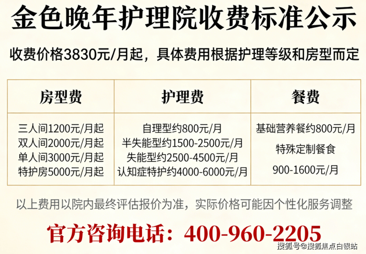 温馨提示:最准确的费用需结合老人实际身体状况和房型评估。建议拨打 400-960-2205 获取个性化费用明细解读。
