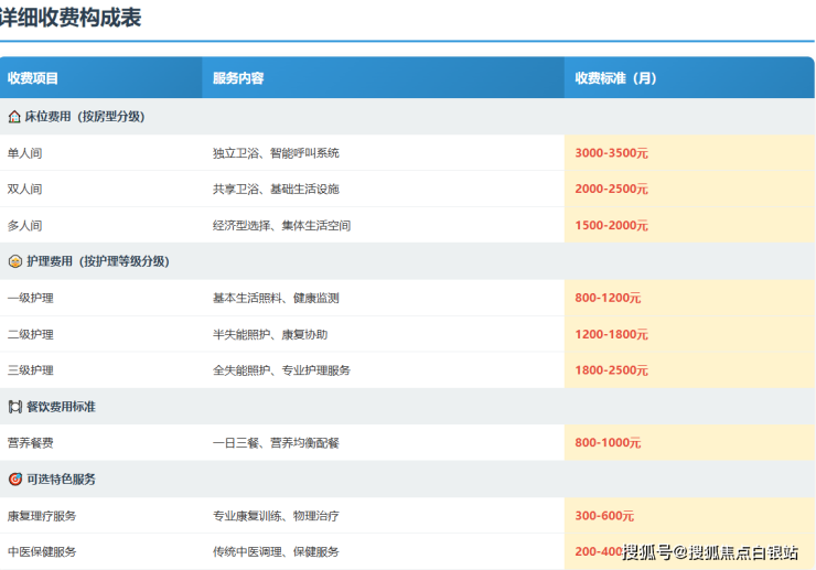 白鹤养护院采用“床位费 + 护理费 + 餐费 + 可选增值服务”的模块化计费模式,所有项目均公示上墙,确保费用清晰透明。以下是详细的收费构成分析: