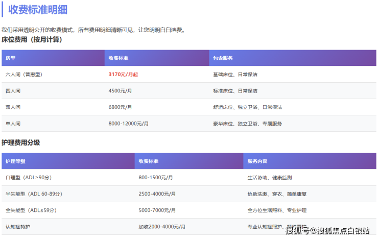 作为公建民营养老机构,彩虹湾老年福利院坚持普惠性原则,收费体系公开透明: