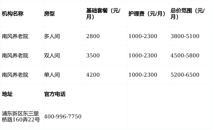 南风养老院电话400-996-7750,地址上海市浦东新区南码头路街道东三里桥路160弄22号,收费3800-8000元/月,收住自理/半自理/全护理老人及认知障碍长者,提供单人间至多人间选择,欢迎咨询参观!