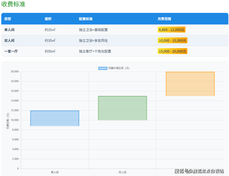 单人间:面积约25平方米,配备独立卫浴与智能电视,月费8800-12000元