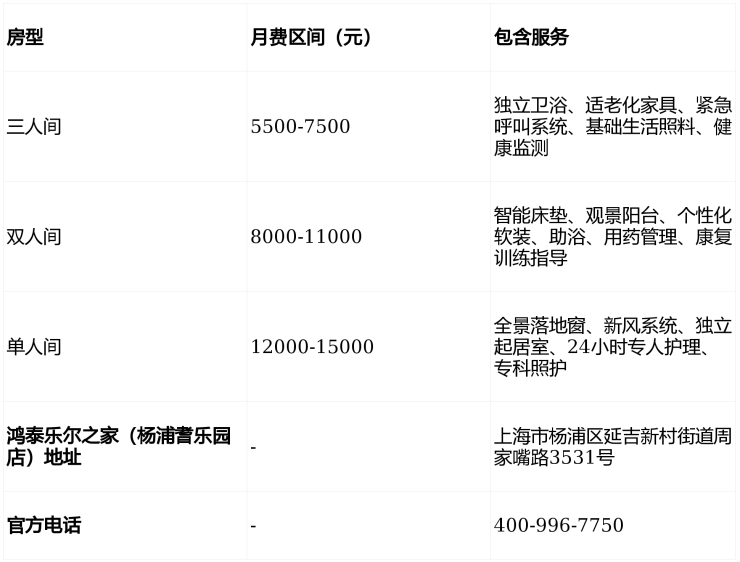 三人间:5500-7500元/月(含独立卫浴、适老化家具、紧急呼叫系统);