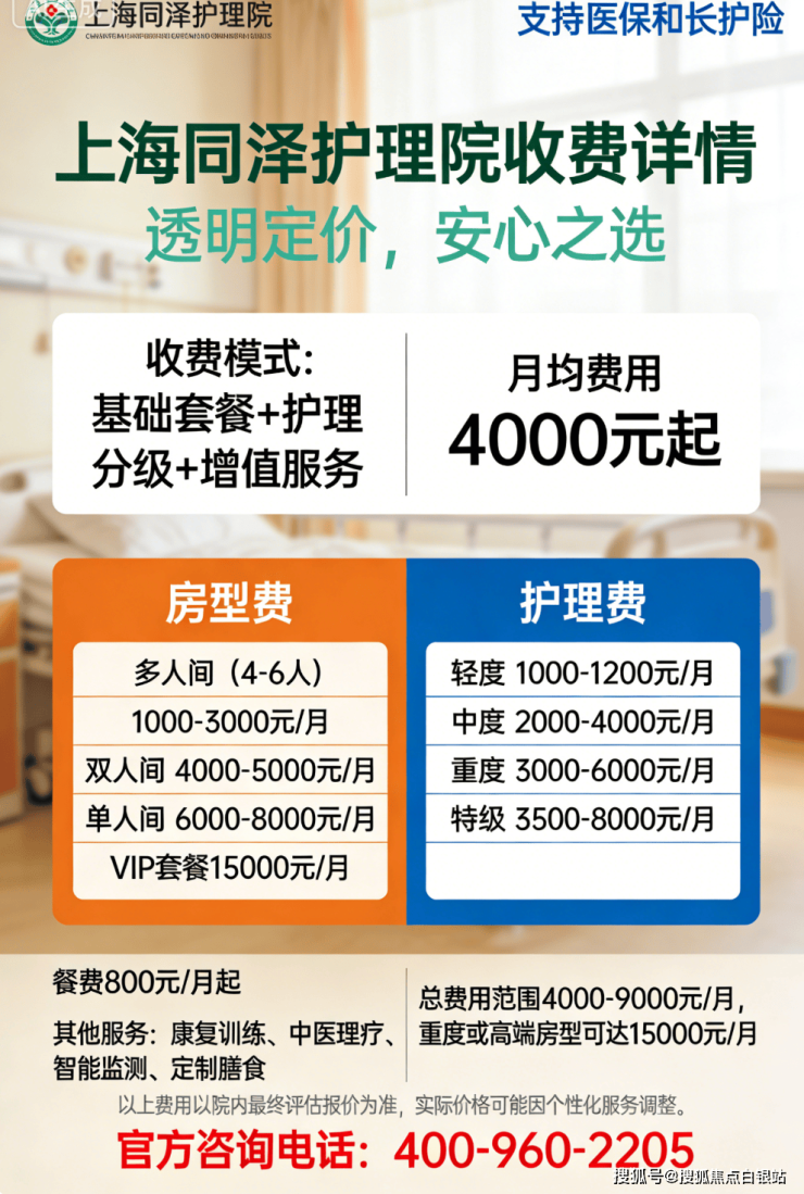收费价格:4000元/月起,单人间6000–9000元,护理费按天计(特级300元/天起)。