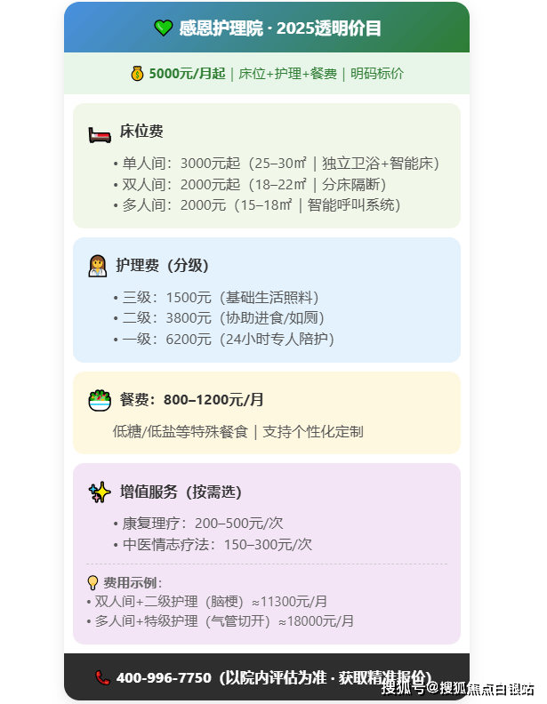 参考收费区间为5000元/月起,具体费用按“基础床位费+分级护理费+餐费+增值服务”组合计价: