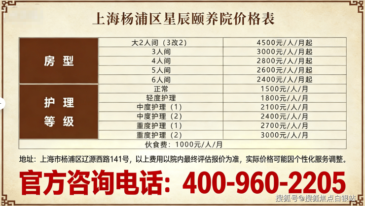 杨浦区养老院价格一览表:星辰颐养院(辽源西路141号地址)2026收费价目表