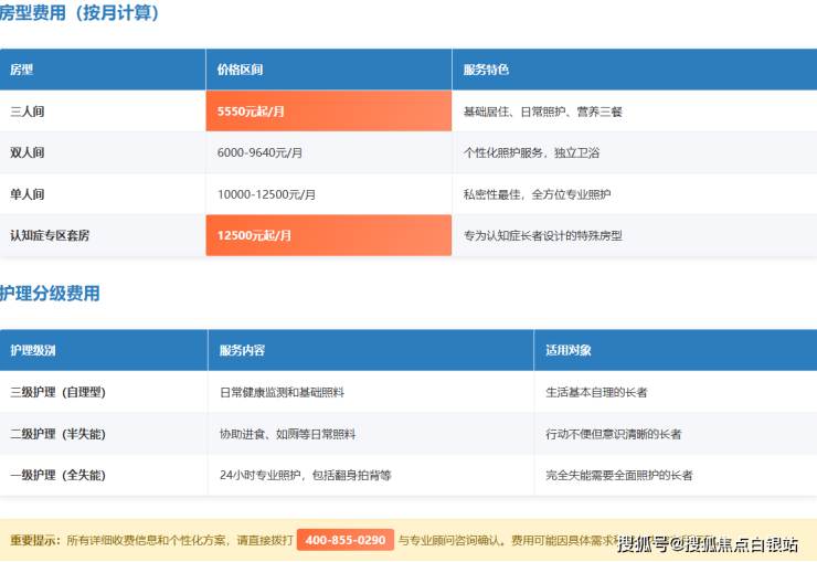 以上所有费用均公开透明,无隐性消费。每月费用通常涵盖基础居住、分级护理、营养膳食及常规健康监测。最终费用需要结合长者身体状况、所选房型及服务需求进行个性化评估确定。建议提前拨打400-855-0290进行详细咨询。