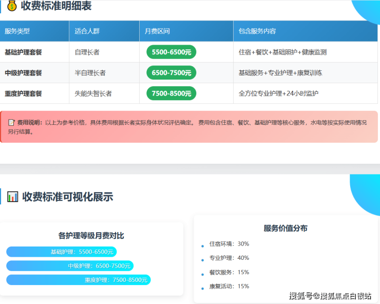 慧享福上海宝山顾村机构的收费体系采用分级管理,月费区间为5000-8500元,具体收费根据长者身体状况和照护等级进行差异化定价:
