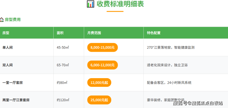 参考价格区间:根据房型、面积、景观及所需护理等级的不同,月度综合费用大致在5000元至25000元之间。这是一个宽泛的区间,具体费用构成下文将详细拆解。