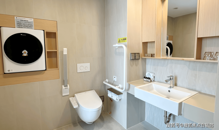 适老细节:圆角家具、隐形扶手、35cm坐高马桶、360°旋转镜柜。