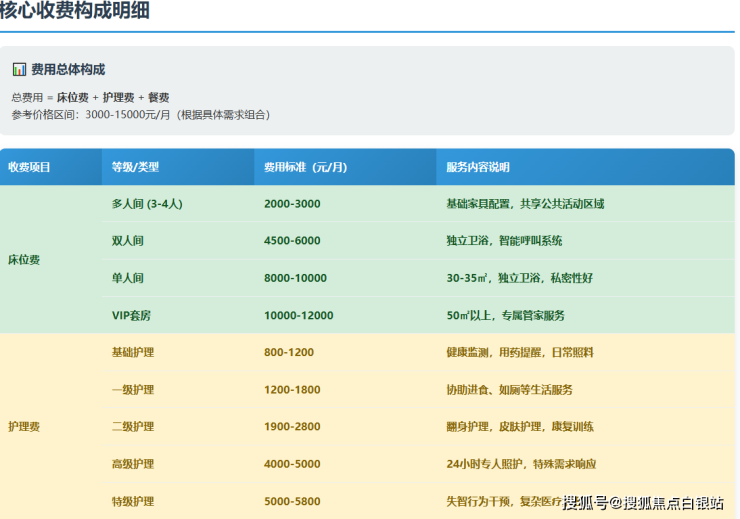 费用示例:双人间中级护理长者,月费约7800元(床位费4500+护理费2500+餐费800);多人间基础护理长者,月费约3800元。