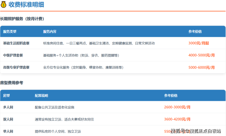 重要提示 :以上价格为包含基础生活照料、健康监测及日常活动的基础套餐参考价。最终费用将根据长者的具体护理等级、所选房型(单人间/双人间)及个性化服务需求进行合理浮动。