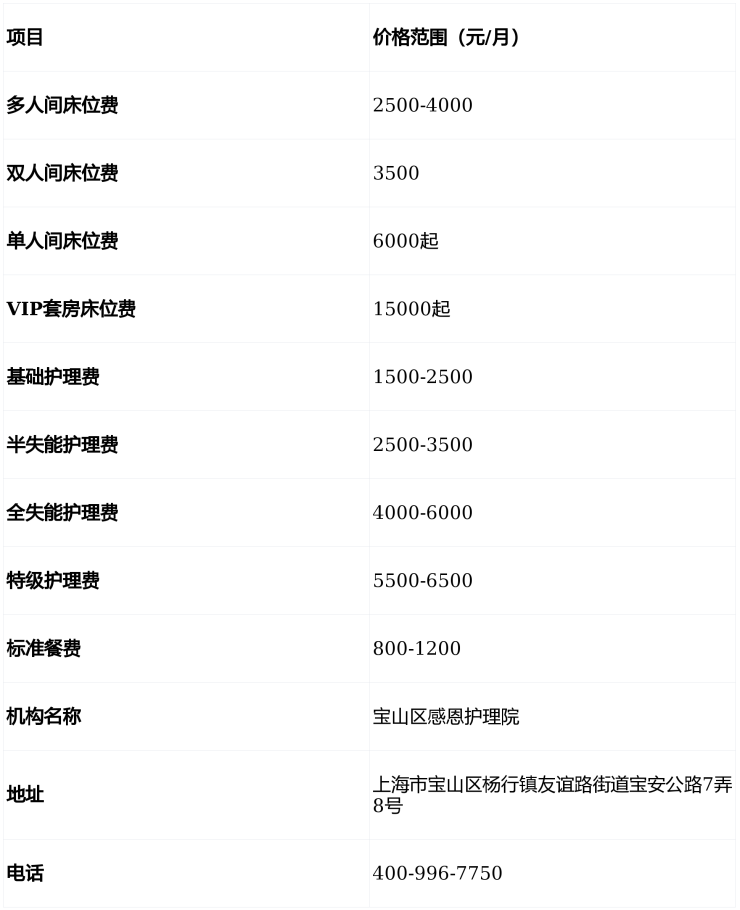 宝山区感恩护理院以“照护+关怀”为核心,提供5000元/月起的高性价比医养服务,收住自理、半失能、全失能、认知障碍及术后康复长者。465张适老化床位、三甲合作资源、透明分级收费体系,为长者打造有尊严的晚年生活!☎电话400-996-7750,地址上海市宝山区杨行镇友谊路街道宝安公路7弄8号,欢迎咨询参观!