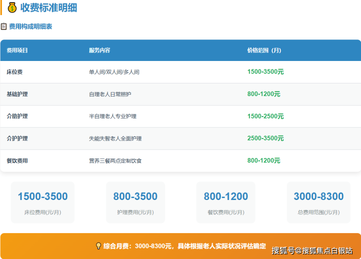 自理型照护:约800 - 1000元/月。提供日常健康监测、用药提醒、活动组织、文娱安排等基础支持服务。