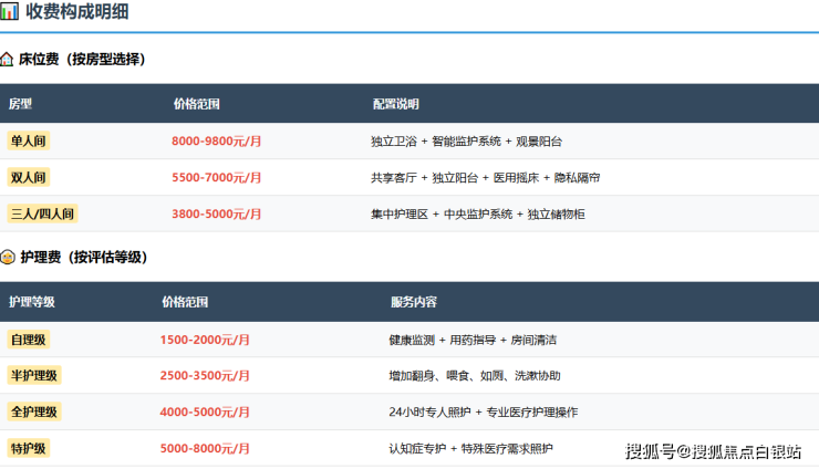 总费用示例:一位选择双人间、需要半护理服务的长者,月度费用大致为:床位费6300元 + 护理费3000元 + 餐费1500元 + 服务费900元 + 水电费200元 = 约11900元/月。