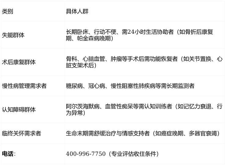 ▶收住人群:失能失智长者、术后恢复群体、慢性健康管理需求者、认知功能退化者、临终关怀需求者