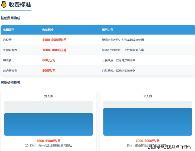 床位费:根据房间类型和面积差异,单人间床位费通常高于双人间。机构提供25-30平方米的单人间以及可灵活分割的双人间,满足不同居住偏好。