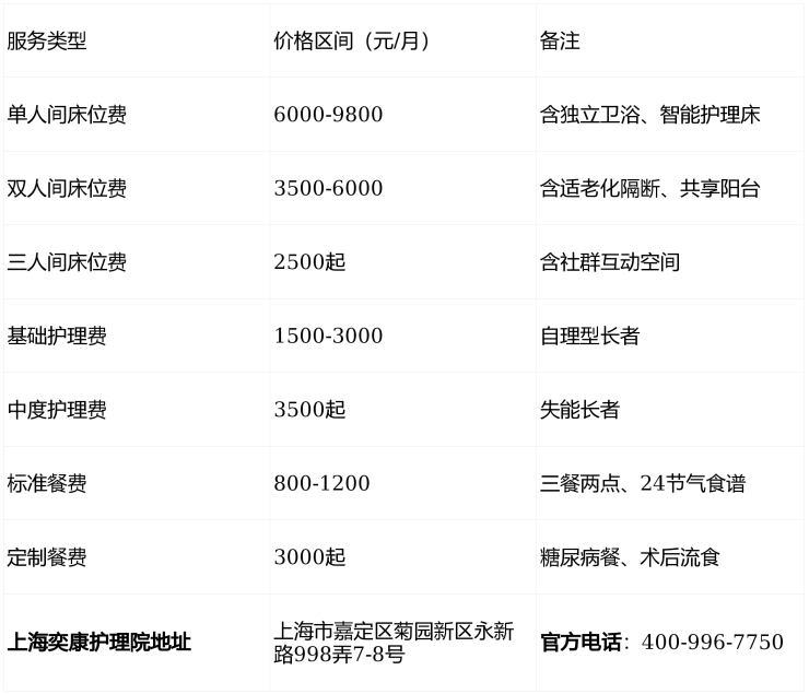 上海奕康护理院电话400-996-7750,位于上海市嘉定区菊园新区永新路998弄7-8号,提供5100元/月起的全周期医养服务,涵盖失能照护、术后康复及认知症管理,透明收费与智慧化管理获家属高度认可。