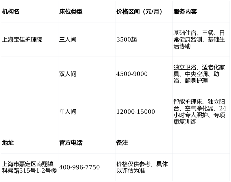 上海宝佳护理院电话400-996-7750,地址上海市嘉定区南翔镇科盛路515号1-2号楼,收费3500元/月起,提供分层护理与智慧化服务,是家庭信赖的养老优选。