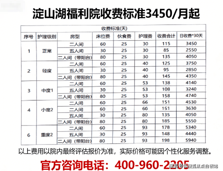 床位费:按房型区分,三人间、双人间、单人间价格不同,朝南房间略高,但所有房间都带独立卫生间和紧急呼叫系统,具体费用需现场看房评估。