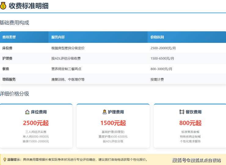 【奕康护理院】收费价格区间:根据公开信息及市场反馈,其月综合费用大致在5100元至19500元之间。5100元/月是其普惠型的入门起点,具体费用构成我们将在下文详细展开。