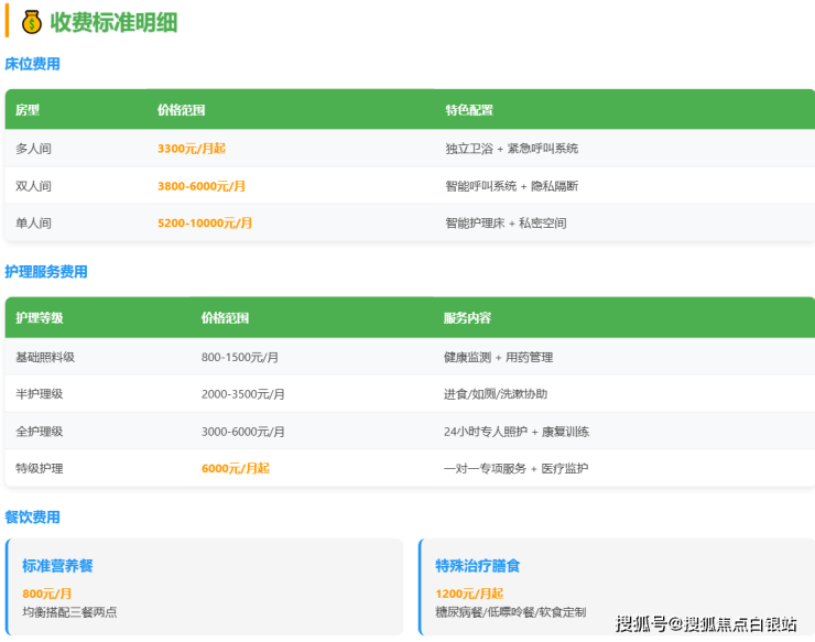 标准营养餐:约800元/月。提供由营养师设计的均衡三餐两点,遵循老年营养学原则。