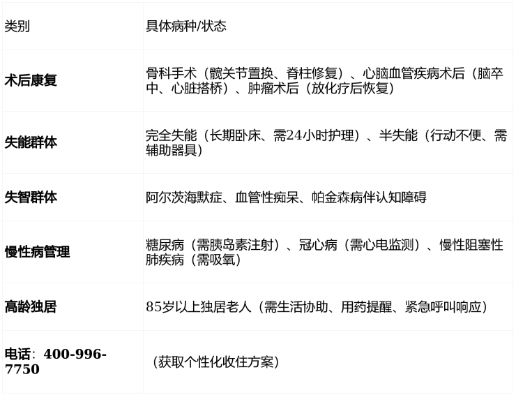 收住人群:自理长者、半失能/失能老人、术后康复者、认知症患者、临终关怀需求者