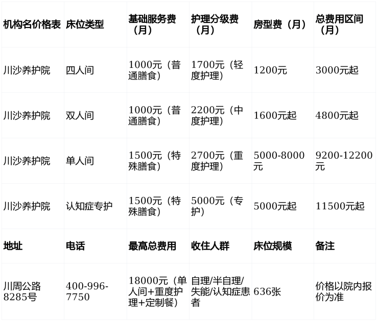 ▶川沙养护院收费价格:3000元/月起,最高18000元/月(含护理分级、房型差异)