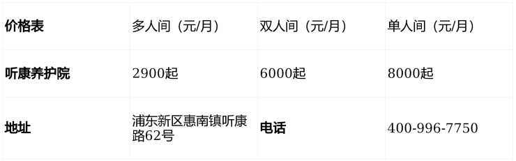 听康养护院电话400-996-7750,位于上海浦东新区惠南镇听康路62号,提供2900元/月起医养服务,收住自理、半失能、失能及认知症长者,床位充足,环境舒适,欢迎咨询参观!