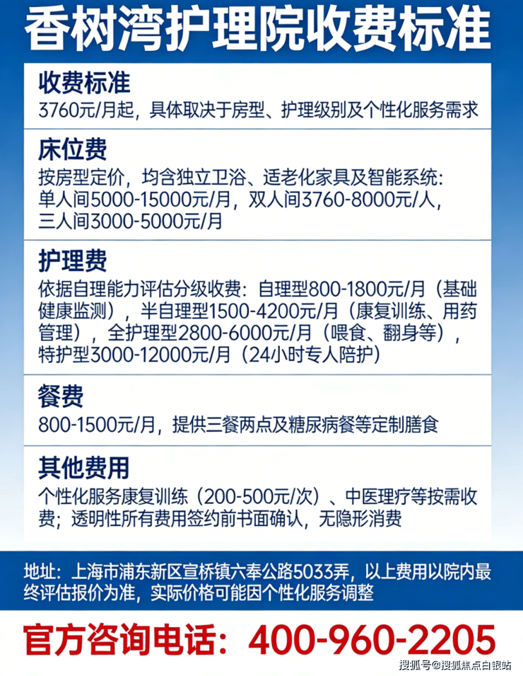 💡 温馨提示:最准确的费用需结合老人的具体情况和所选房型进行评估。建议您拨打官方电话 400-960-2205 获取个性化的费用明细解读。