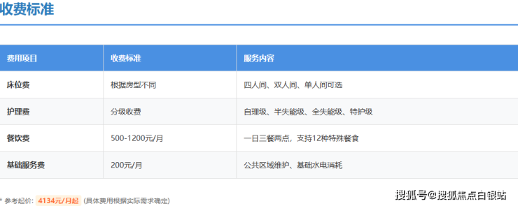 曙东颐养院采用“分项计价、透明公开”的收费模式,所有费用清晰可查,杜绝隐性消费。总费用由床位费、护理费、餐费及少量其他费用构成,月费门槛为4134元起。具体明细如下: