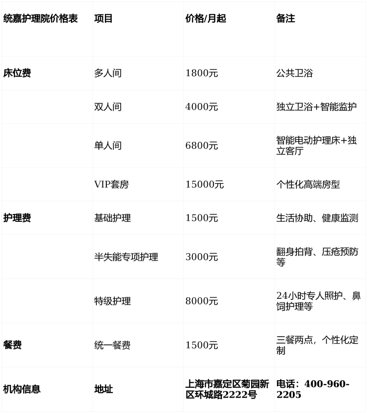 【统嘉护理院】收费标准:4500元/月起(以院内报价为准)
