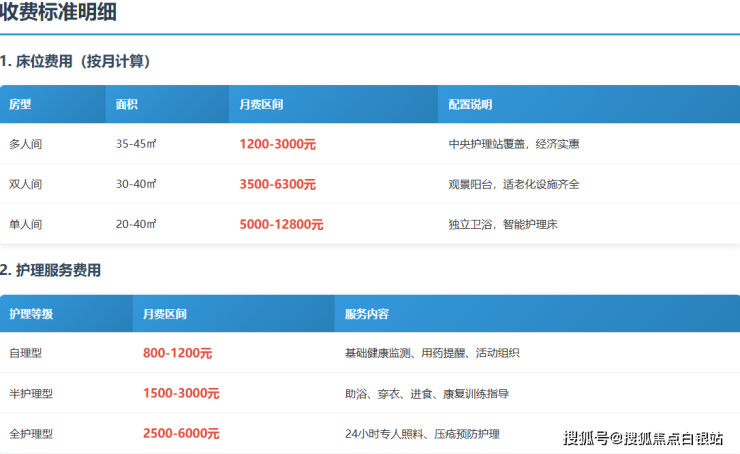 全护理型:2500-6000元/月(提供24小时专人陪护、压疮预防等全面服务)